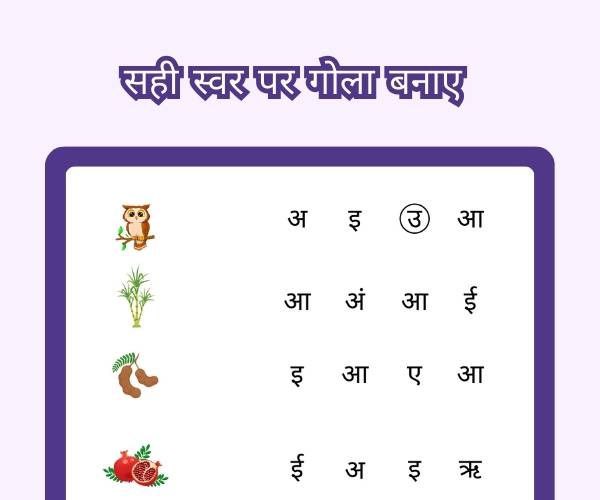 See the pictures carefully, then match them with the correct स्वर. This fun activity helps children recognize Hindi vowels and connect sounds with objects they already know and love.