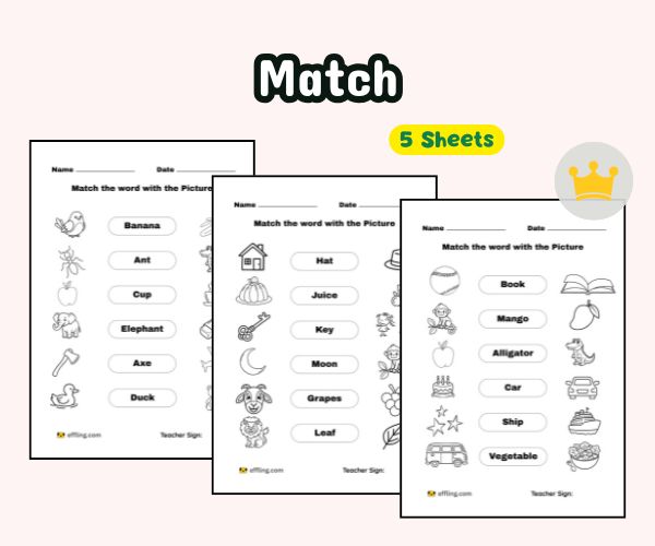 In this activity, children look at pictures and match them with the correct word. It helps young learners connect visual objects with written language. Teachers often use matching exercises like this to strengthen vocabulary and reading skills in early classrooms.