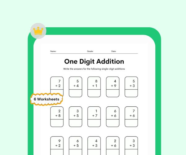 These one-digit addition worksheets are designed to help young learners practice basic math skills in a simple and engaging way. With 6 printable worksheets, children can build confidence in adding numbers from 0–9 while improving their number recognition and problem-solving ability. These worksheets are ideal for preschool, nursery, LKG, and UKG students. Regular practice helps strengthen early math foundations, improve concentration, and develop essential calculation skills in a fun and structured learning format.